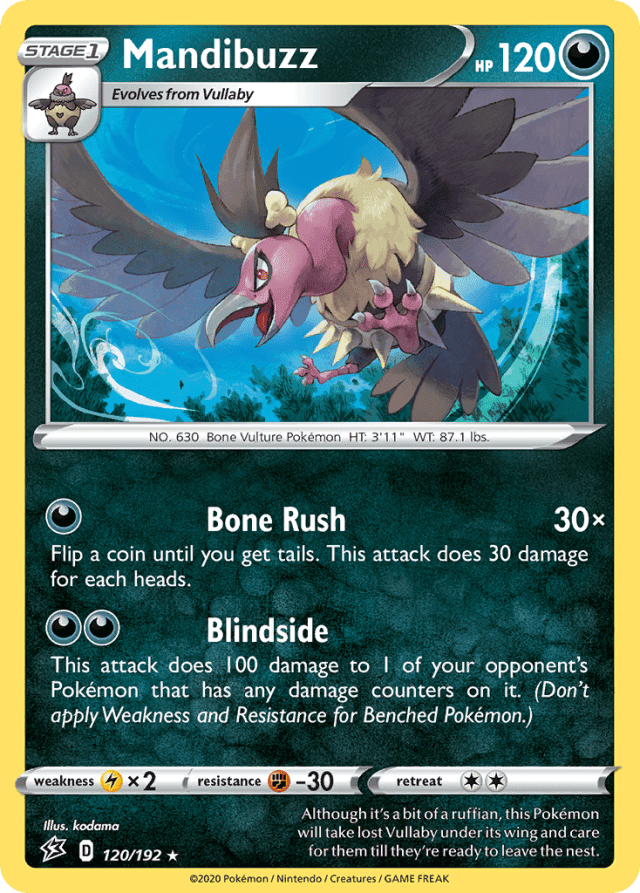 Although it's a bit of a ruffian, this Pokémon will take lost Vullaby under its wing and care for them till they're ready to leave the nest.