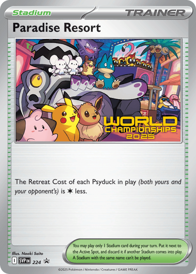 The Retreat Cost of each Psyduck in play (both yours and your opponent's) is Colorless less. You may play only 1 Stadium card during your turn. Put it next to the Active Spot, and discard it if another Stadium comes into play. A Stadium with the same name can't be played.