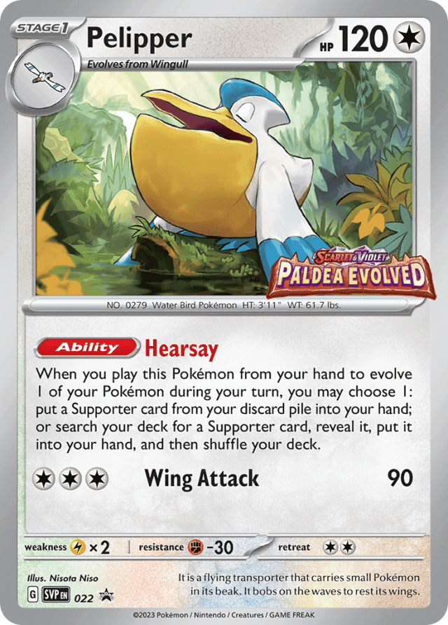 When you play this Pokémon from your hand to evolve 1 of your Pokémon during your turn, you may choose 1: put a Supporter card from your discard pile into your hand; or search your deck for a Supporter card, reveal it, put it into your hand, and then shuffle your deck.
