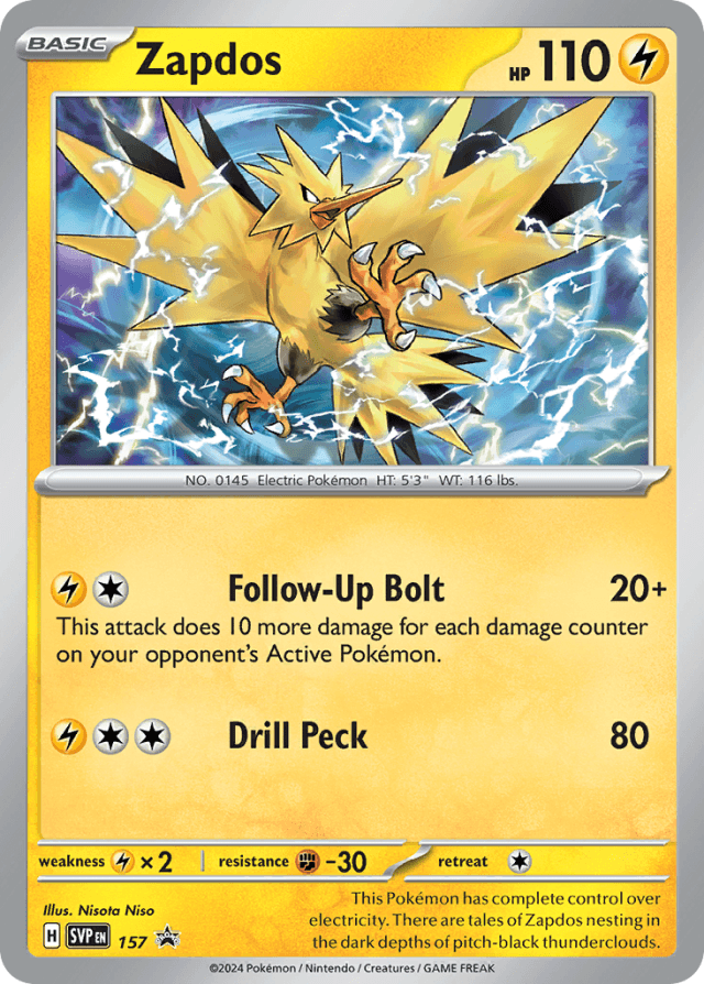 This Pokémon has complete control over electricity. There are tales of Zapdos nesting in the dark depths of pitch-black thunderclouds.
