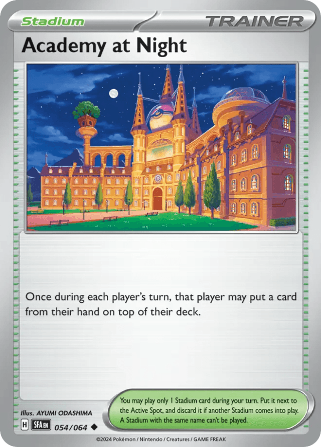 Once during each player's turn, that player may put a card from their hand on top of their deck. You may play only 1 Stadium card during your turn. Put it next to the Active Spot, and discard it if another Stadium comes into play. A Stadium with the same name can't be played.