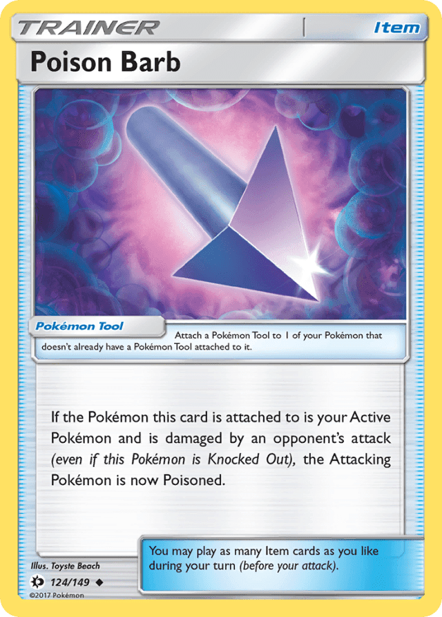 Attach a Pokémon Tool to 1 of your Pokémon that doesn't already have a Pokémon Tool attached to it. If the Pokémon this card is attached to is your Active Pokémon and is damaged by an opponent's attack (even if this Pokémon is Knocked Out), the Attacking Pokémon is now Poisoned. You may play as many Item cards as you like during your turn (before your attack).