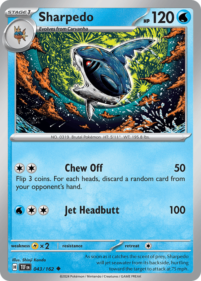 As soon as it catches the scent of prey, Sharpedo will jet seawater from its backside, hurtling toward the target to attack at 75 mph.