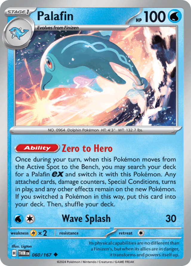 Once during your turn, when this Pokémon moves from the Active Spot to the Bench, you may search your deck for a Palafin ex and switch it with this Pokémon. Any attached cards, damage counters, Special Conditions, turns in play, and any other effects remain on the new Pokémon. If you switched a Pokémon in this way, put this card into your deck. Then, shuffle your deck.
