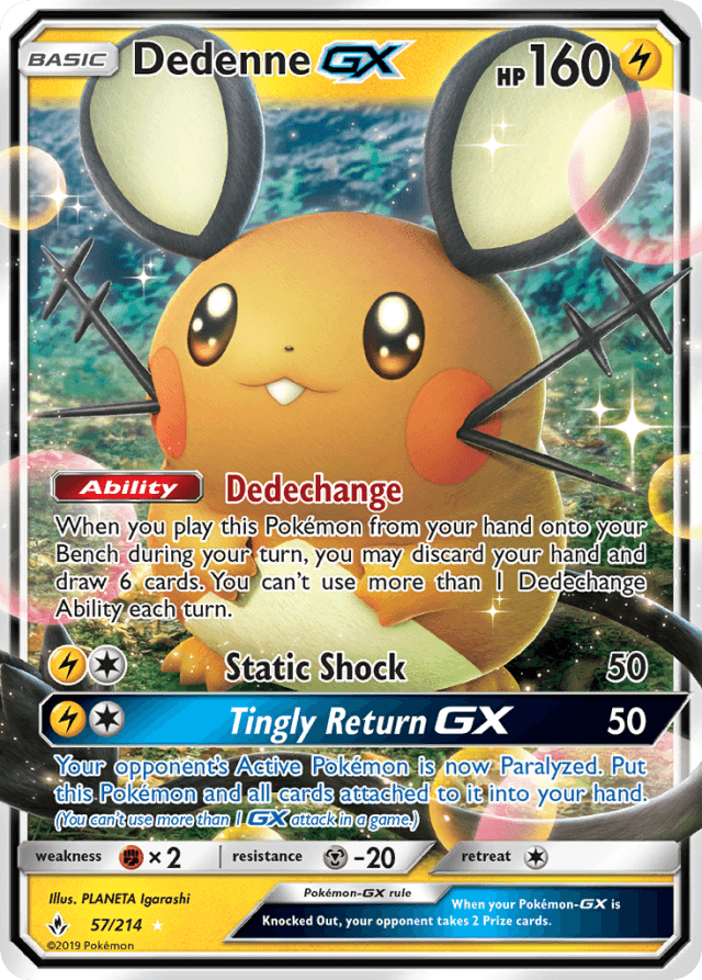 When you play this Pokémon from your hand onto your Bench during your turn, you may discard your hand and draw 6 cards. You can't use more than 1 Dedechange Ability each turn.