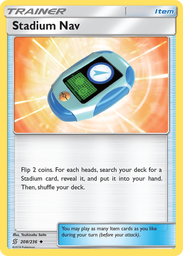 Flip 2 coins. For each heads, search your deck for a Stadium card, reveal it, and put it into your hand. Then, shuffle your deck. You may play as many Item cards as you like during your turn (before your attack).
