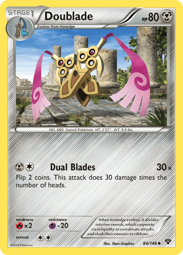 When Honedge evolves, it divides into two swords, which cooperate via telepathy to coordinate attacks and slash their enemies to ribbons.