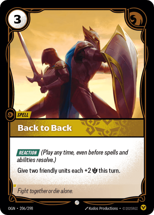 [Reaction] (Play any time, even before spells and abilities resolve.) Give two friendly units each +2 {M} this turn.