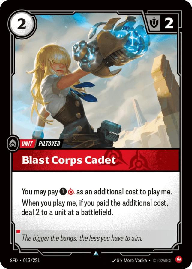 You may pay {1}{FR} as an additional cost to play me. When you play me, if you paid the additional cost, deal 2 to a unit at a battlefield.