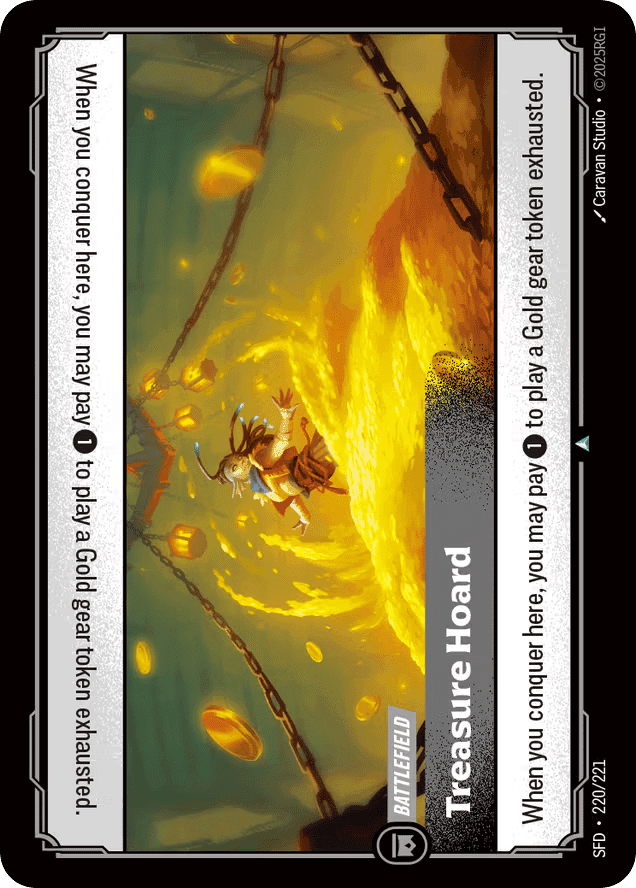 When you conquer here, you may pay {1} to play a Gold gear token exhausted.