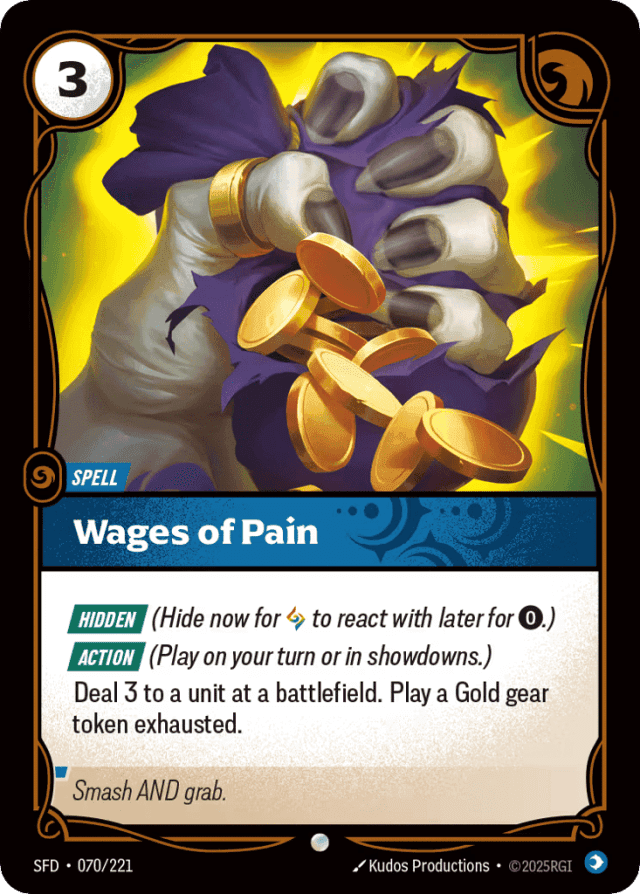 [Hidden] (Hide now for {RR} to react with later for {0}.) [Action] (Play on your turn or in showdowns.) Deal 3 to a unit at a battlefield. Play a Gold gear token exhausted.
